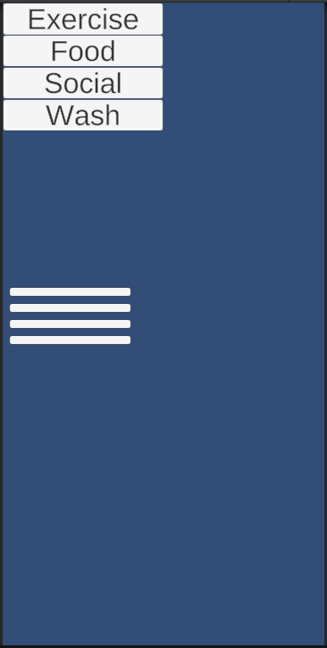 One of the key areas I identified to prototype for this project was the different health meters that would serve to demonstrate the pet's health. The idea for these four energy bars is that they would each slowly drain over time, and if any of the four reached zero, it would result in the pet's death. In order to refill these, the player would play an associated minigame - one each for exercising, washing, feeding, and using social media.